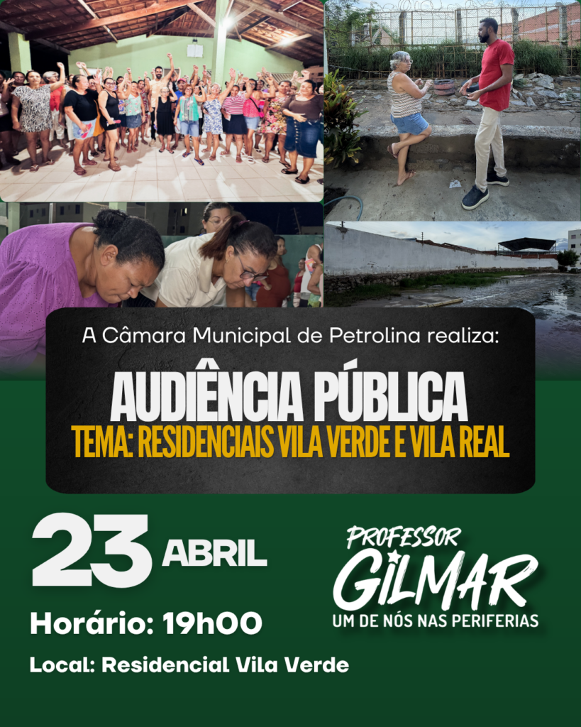A Câmara Municipal de Petrolina realizará, nesta quinta-feira (23), às 19h, no espaço de eventos do Residencial Vila Verde, uma audiência pública que vai tratar dos graves problemas de saneamento, drenagem e estrutura enfrentados por moradores/as dos residenciais Vila Verde e Vila Real.