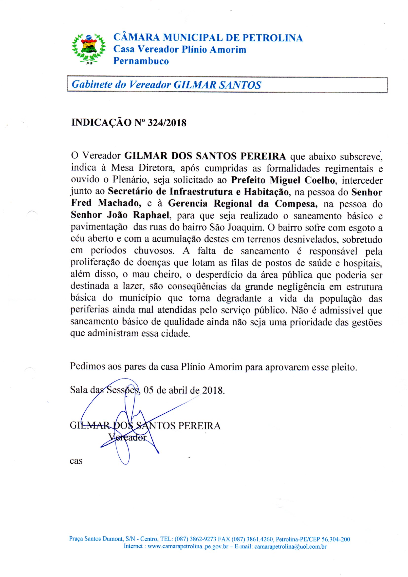 Indicação N° 324/2018 – São Joaquim – Saneamento/ Pavimentação- Aprovado em 05/04/2018 Baixar Arquivo