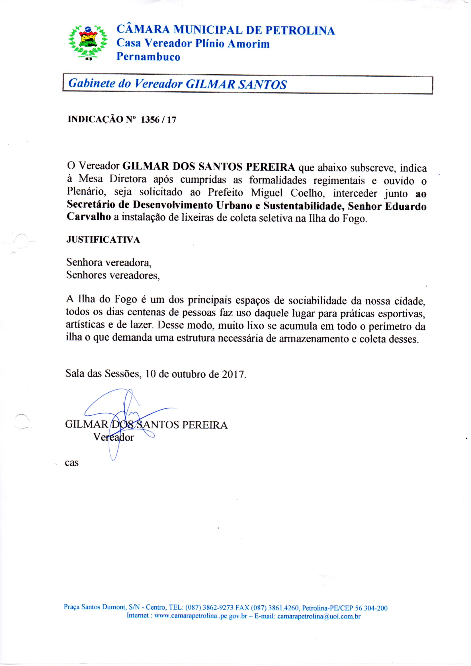 Indicação Nº 1356/2017 – Ilha do Fogo – Instalação de lixeiras – Aprovado em 10/10/2017 Baixar Arquivo