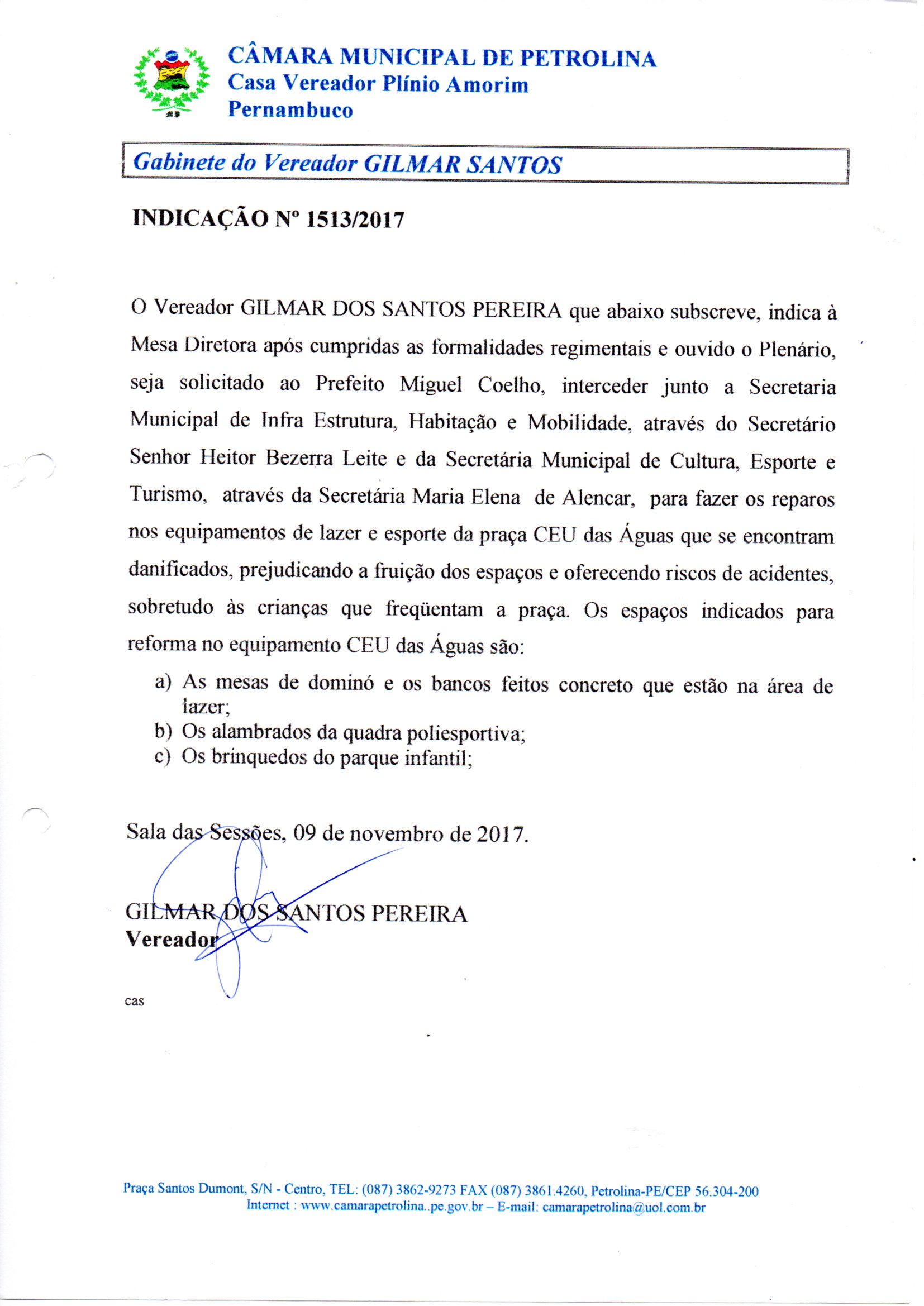 Indicação Nº 1513/2017 – CEU da Águas – Reparos nos equipamentos de lazer e esporte – Aprovado em 09/11/2017 Baixar Arquivo