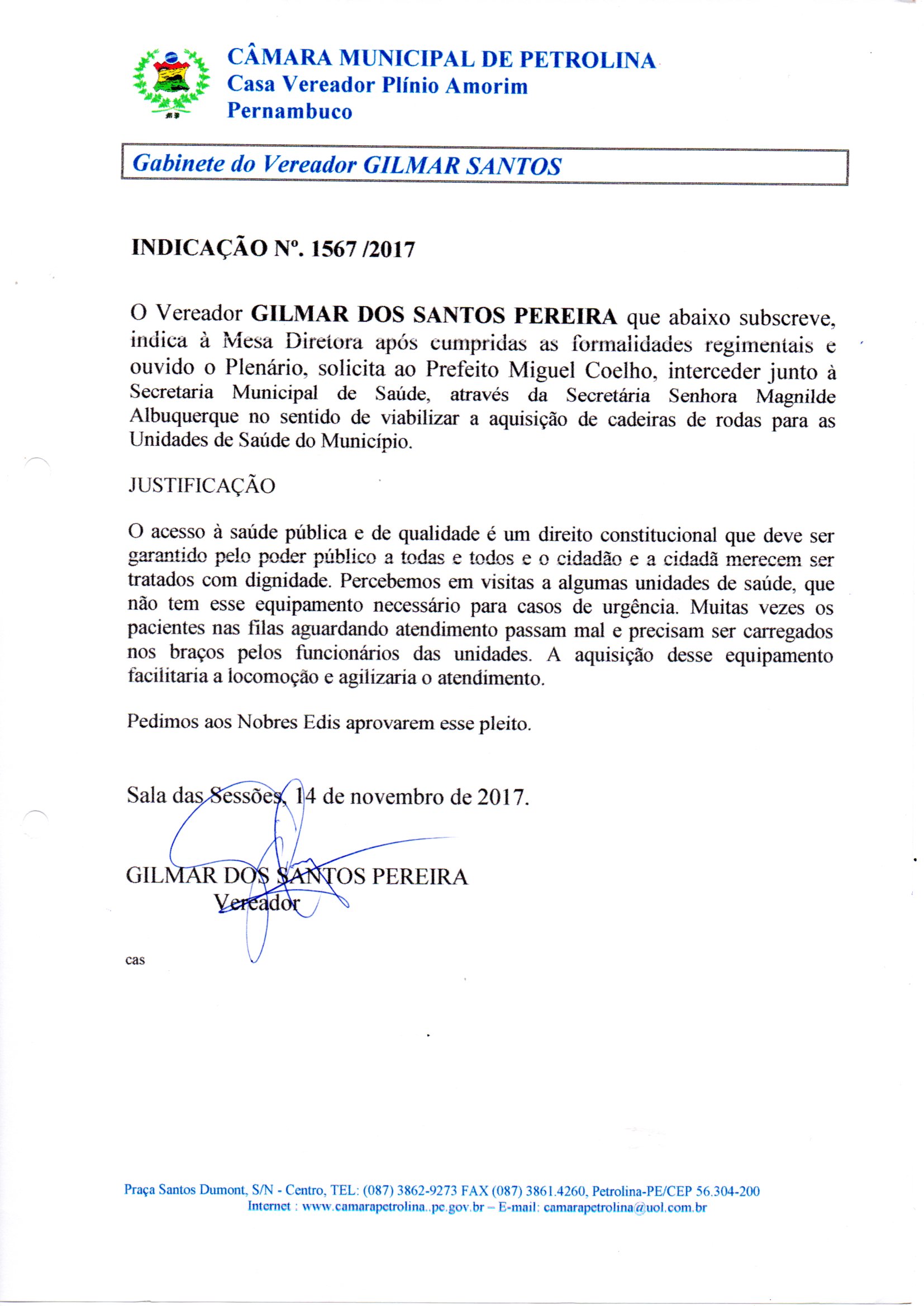 Indicação Nº 1567/2017 – Unidades de Saúde – Aquisição de cadeiras de roda – Aprovado em 14/11/2017 Baixar Arquivo