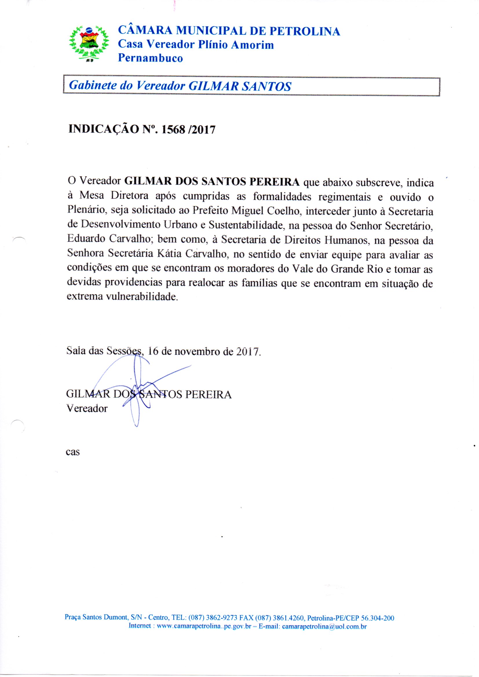 Indicação Nº 1568/2017 – Vale Grande Rio – Situação dos moradores – Aprovado em 16/11/2017 Baixar Arquivo