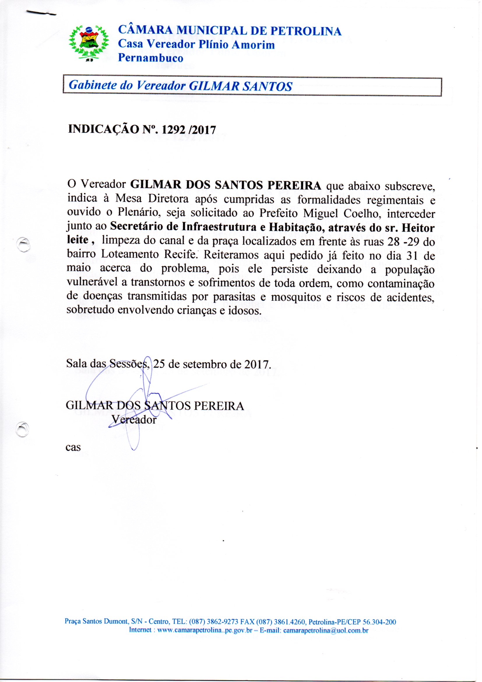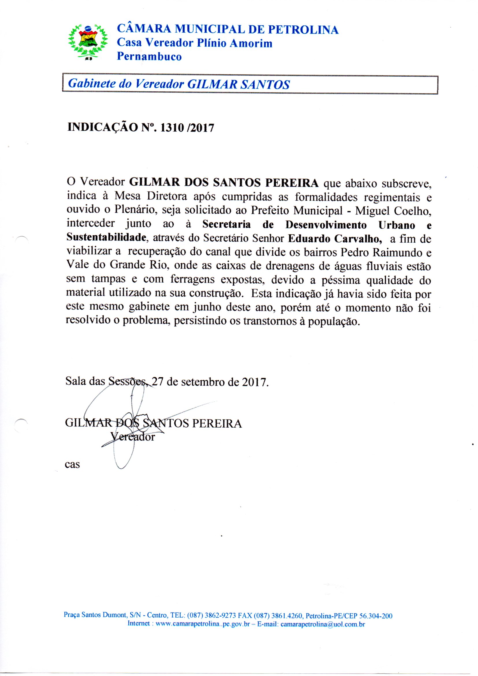 Indicação Nº 1310/2017 – Pedro Raimundo/ Vale do Grande Rio – Recuperação do Canal – Aprovado em 27/09/2017 Baixar Arquivo