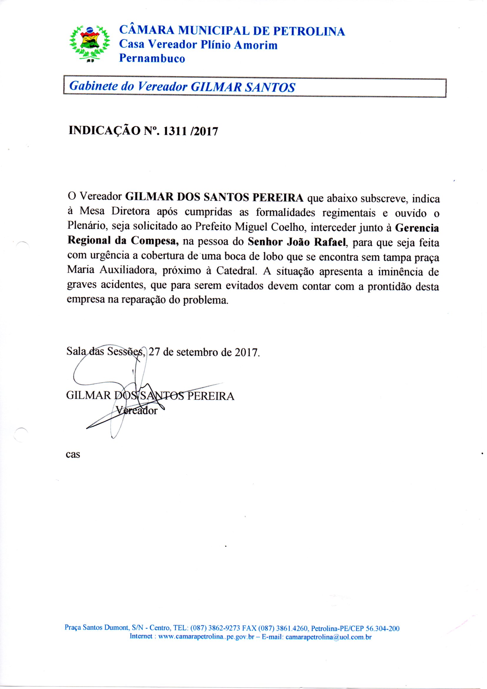 Indicação Nº 1311/2017 – Centro – Cobertura de uma boca de lobo – Aprovado em 27/09/2017 Baixar Arquivo