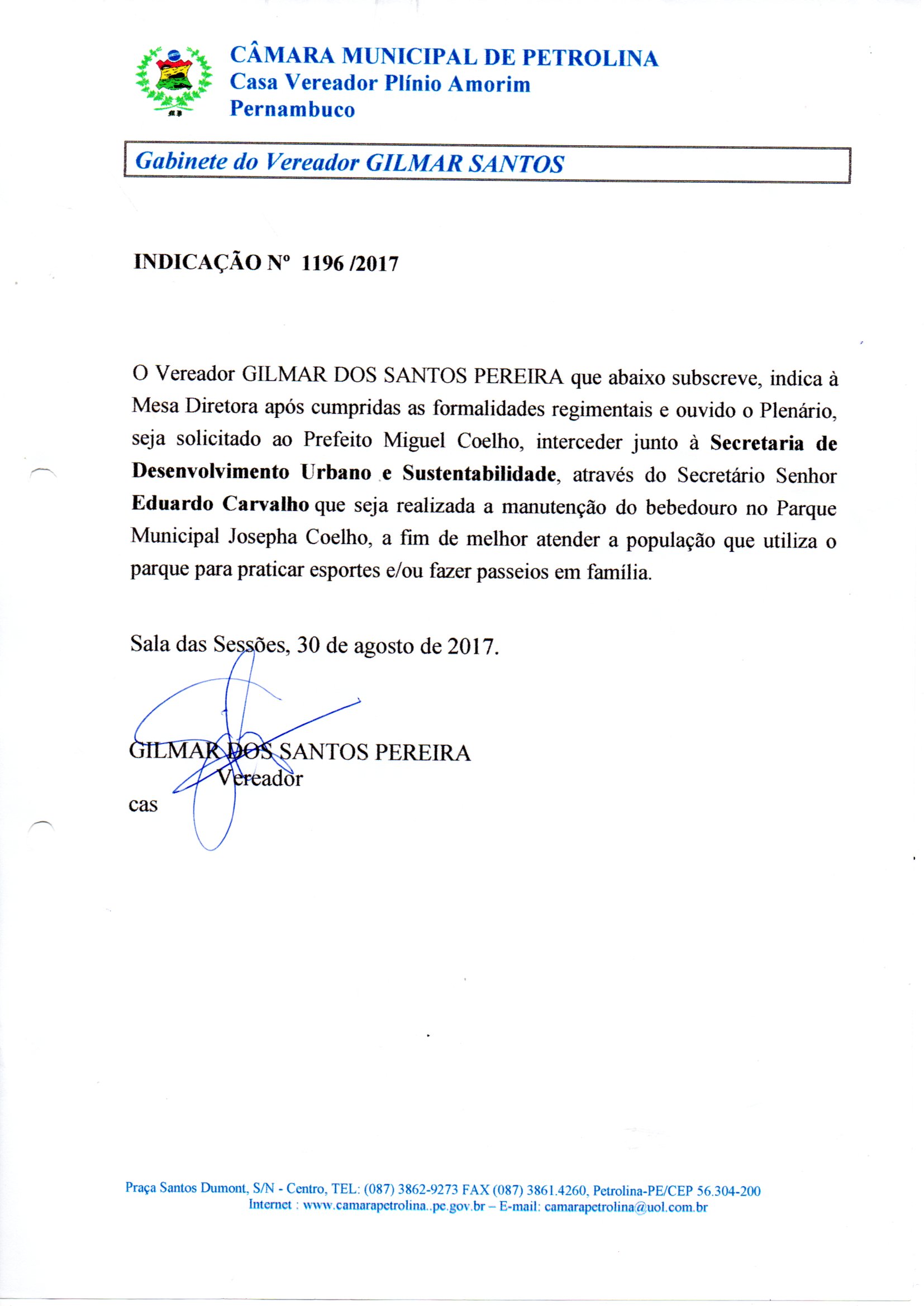 Indicação Nº 1196/2017 – Parque Municipal – Manutenção de bebedouro – Aprovado em 30/08/2017 Baixar Arquivo