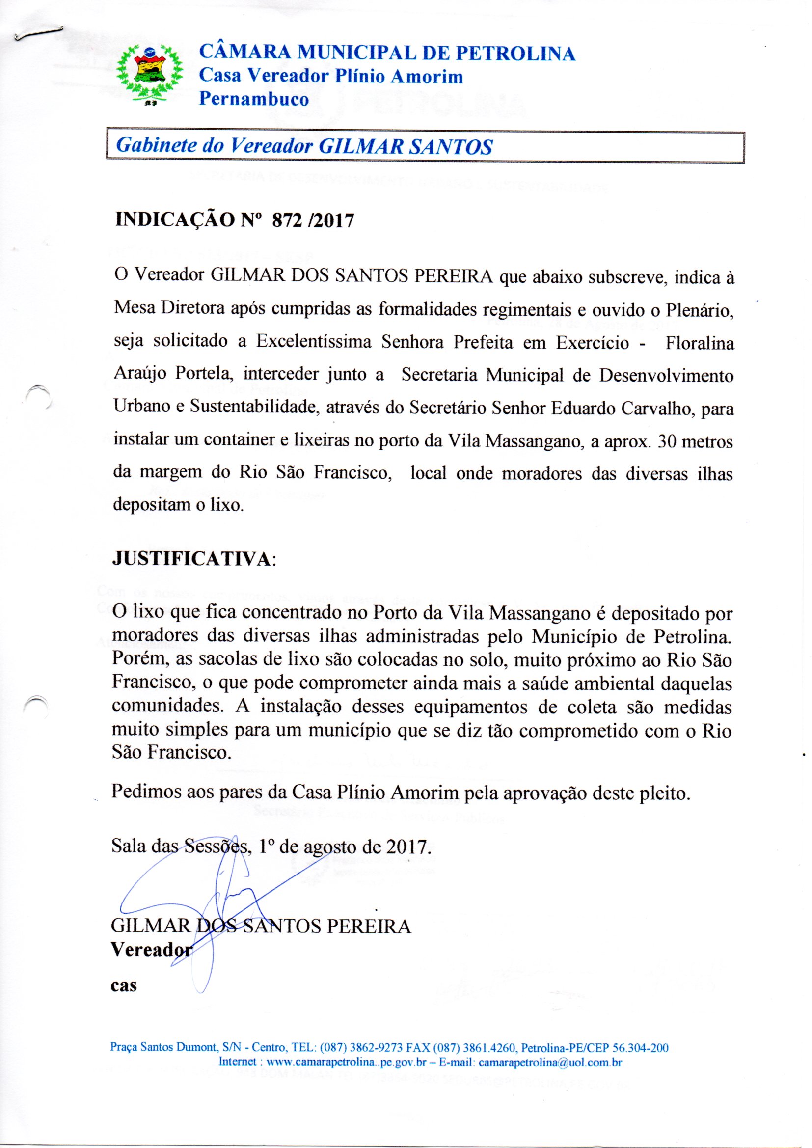Indicação Nº 872/2017 – Vila Massangano – Instalação de container e lixeiras – Aprovado em 01/08/2017 Baixar Arquivo
