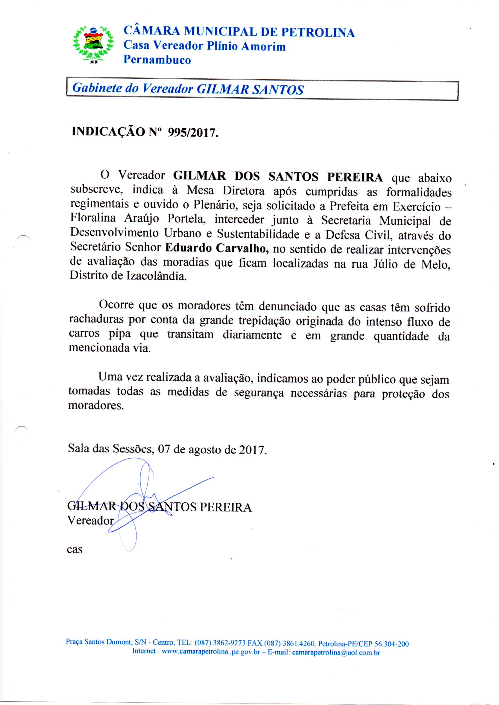Indicação Nº 995/2017 – Distrito de Izacolândia – Avaliação das moradias – Aprovado em 07/08/2017 Baixar Arquivo
