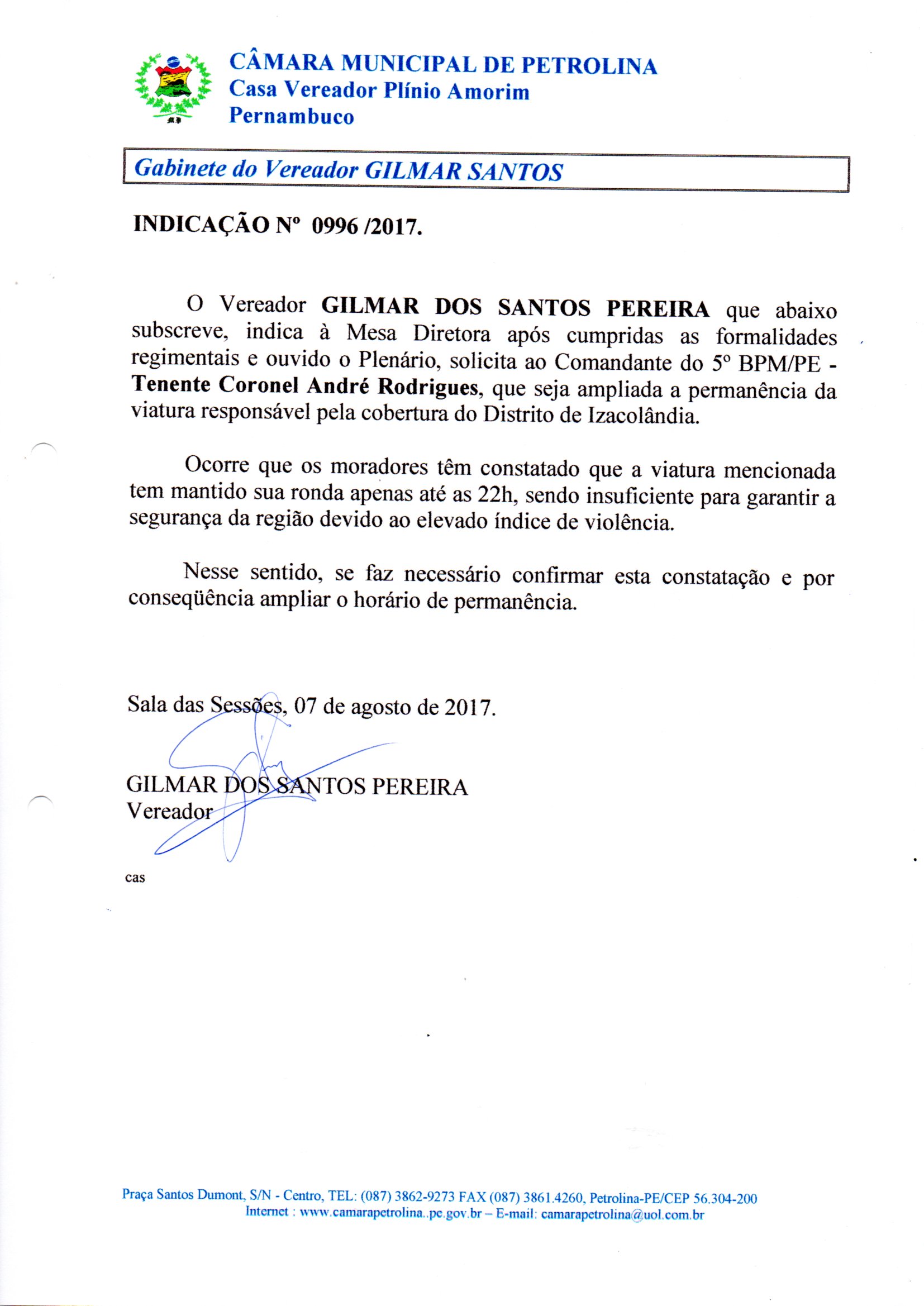 Indicação Nº 996/2017 – Distrito de Izacolândia – Permanência da viatura – Aprovado em 07/08/2017 Baixar Arquivo