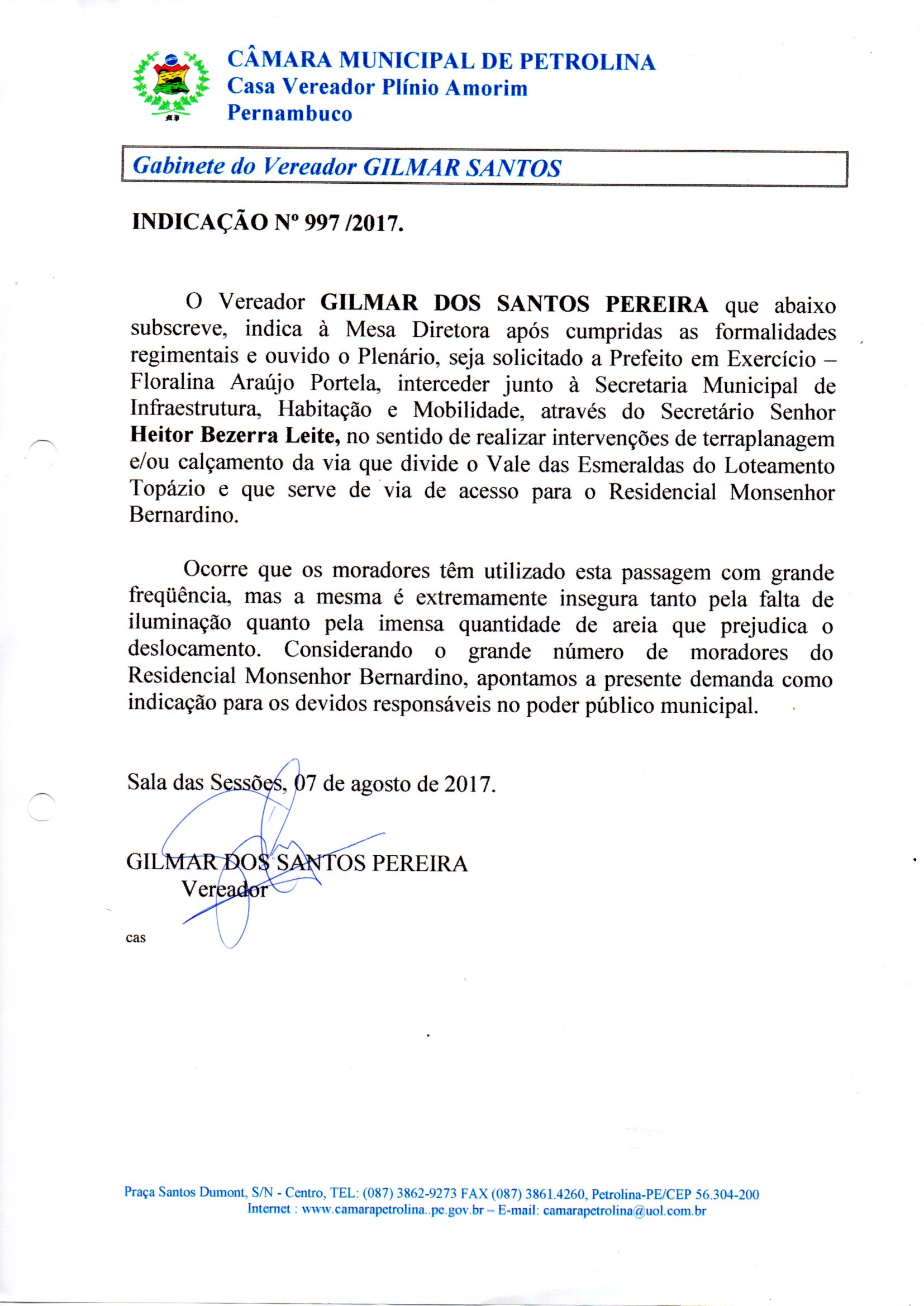 Indicação Nº 997/2017 – Loteamento Topázio/ Residencial Monsenhor Bernardino – Terraplanagem/ Calçamento – Aprovado em 07/08/2017 Baixar Arquivo